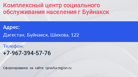 Комплексный центр социального обслуживания населения, г. Буйнакск по адресу Дагестан, Буйнакск, Шихова, 122 в дальнейшем Организация, размещена в следующих категориях:
