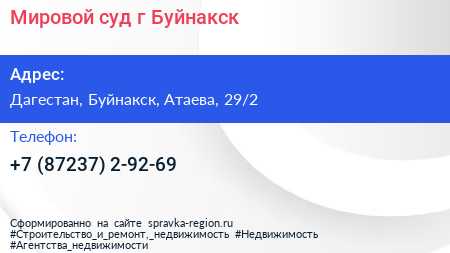 Мировой суд, г. Буйнакск по адресу Дагестан, Буйнакск, Атаева, 29/2 в дальнейшем Организация, размещена в следующих категориях: