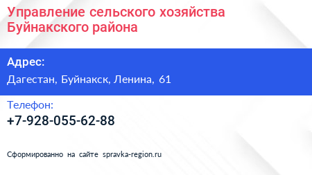 Управление сельского хозяйства Буйнакского района по адресу Дагестан, Буйнакск, Ленина, 61 в дальнейшем Организация, размещена в следующих категориях: