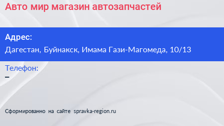 Авто мир, магазин автозапчастей по адресу Дагестан, Буйнакск, Имама Гази-Магомеда, 10/13 в дальнейшем Организация, размещена в следующих категориях: