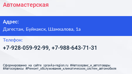 Автомастерская по адресу Дагестан, Буйнакск, Шамхалова, 1а в дальнейшем Организация, размещена в следующих категориях: