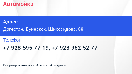 Автомойка по адресу Дагестан, Буйнакск, Шихсаидова, 88 в дальнейшем Организация, размещена в следующих категориях: