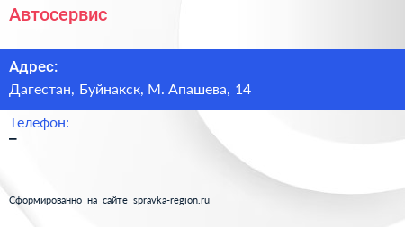 Автосервис по адресу Дагестан, Буйнакск, М. Апашева, 14 в дальнейшем Организация, размещена в следующих категориях:
