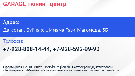 GARAGE, тюнинг-центр по адресу Дагестан, Буйнакск, Имама Гази-Магомеда, 5Б в дальнейшем Организация, размещена в следующих категориях: