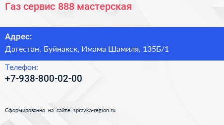 Газ сервис 888, мастерская по адресу Дагестан, Буйнакск, Имама Шамиля, 135Б/1 в дальнейшем Организация, размещена в следующих категориях: