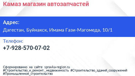 Камаз, магазин автозапчастей по адресу Дагестан, Буйнакск, Имама Гази-Магомеда, 10/1 в дальнейшем Организация, размещена в следующих категориях: