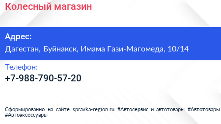 Колесный магазин по адресу Дагестан, Буйнакск, Имама Гази-Магомеда, 10/14 в дальнейшем Организация, размещена в следующих категориях: