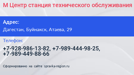 М Центр, станция технического обслуживания по адресу Дагестан, Буйнакск, Атаева, 29 в дальнейшем Организация, размещена в следующих категориях:
