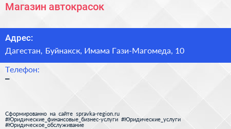 Магазин автокрасок по адресу Дагестан, Буйнакск, Имама Гази-Магомеда, 10 в дальнейшем Организация, размещена в следующих категориях:
