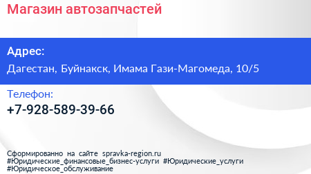 Магазин автозапчастей по адресу Дагестан, Буйнакск, Имама Гази-Магомеда, 10/5 в дальнейшем Организация, размещена в следующих категориях: