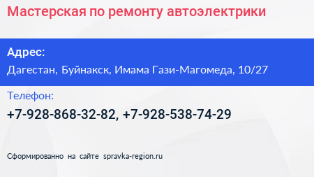 Мастерская по ремонту автоэлектрики по адресу Дагестан, Буйнакск, Имама Гази-Магомеда, 10/27 в дальнейшем Организация, размещена в следующих категориях: