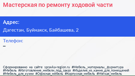 Мастерская по ремонту ходовой части по адресу Дагестан, Буйнакск, Байбашева, 2 в дальнейшем Организация, размещена в следующих категориях: