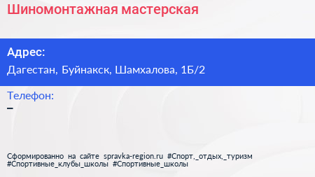 Шиномонтажная мастерская по адресу Дагестан, Буйнакск, Шамхалова, 1Б/2 в дальнейшем Организация, размещена в следующих категориях: