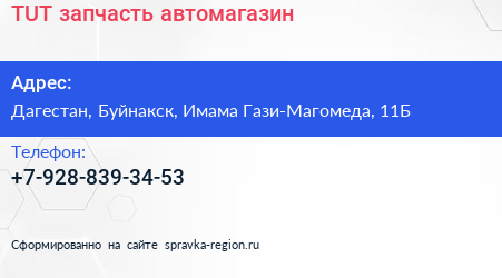 TUT запчасть, автомагазин по адресу Дагестан, Буйнакск, Имама Гази-Магомеда, 11Б в дальнейшем Организация, размещена в следующих категориях: