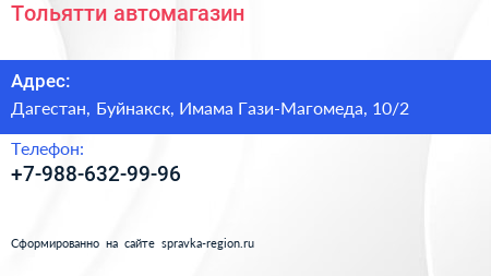 Тольятти, автомагазин по адресу Дагестан, Буйнакск, Имама Гази-Магомеда, 10/2 в дальнейшем Организация, размещена в следующих категориях: