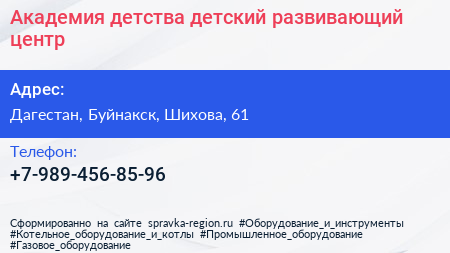 Академия детства, детский развивающий центр по адресу Дагестан, Буйнакск, Шихова, 61 в дальнейшем Организация, размещена в следующих категориях: