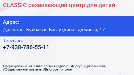 CLASSIC, развивающий центр для детей по адресу Дагестан, Буйнакск, Багаутдина Гаджиева, 17 в дальнейшем Организация, размещена в следующих категориях: