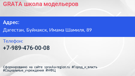 GRATA, школа модельеров по адресу Дагестан, Буйнакск, Имама Шамиля, 89 в дальнейшем Организация, размещена в следующих категориях: