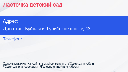 Ласточка, детский сад по адресу Дагестан, Буйнакск, Гунибское шоссе, 43 в дальнейшем Организация, размещена в следующих категориях: