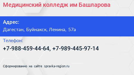 Медицинский колледж им. Башларова по адресу Дагестан, Буйнакск, Ленина, 57а в дальнейшем Организация, размещена в следующих категориях: