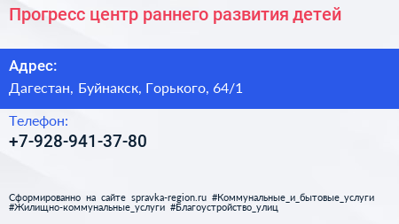 Прогресс, центр раннего развития детей по адресу Дагестан, Буйнакск, Горького, 64/1 в дальнейшем Организация, размещена в следующих категориях: