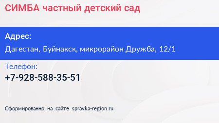 СИМБА, частный детский сад по адресу Дагестан, Буйнакск, микрорайон Дружба, 12/1 в дальнейшем Организация, размещена в следующих категориях: