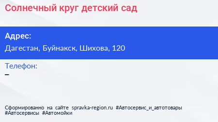 Солнечный круг, детский сад по адресу Дагестан, Буйнакск, Шихова, 120 в дальнейшем Организация, размещена в следующих категориях: