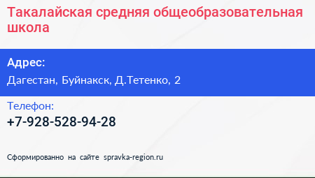 Такалайская средняя общеобразовательная школа по адресу Дагестан, Буйнакск, Д.Тетенко, 2 в дальнейшем Организация, размещена в следующих категориях: