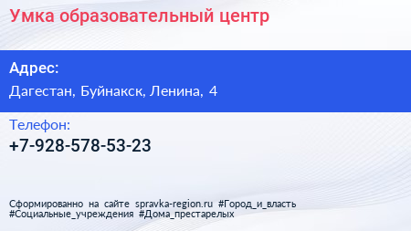Умка, образовательный центр по адресу Дагестан, Буйнакск, Ленина, 4 в дальнейшем Организация, размещена в следующих категориях: