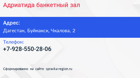 Адриатида, банкетный зал по адресу Дагестан, Буйнакск, Чкалова, 2 в дальнейшем Организация, размещена в следующих категориях:
