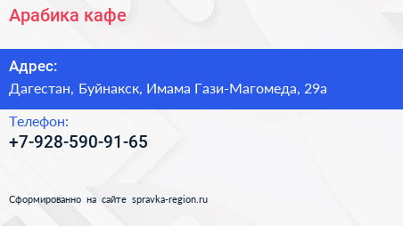 Арабика, кафе по адресу Дагестан, Буйнакск, Имама Гази-Магомеда, 29а в дальнейшем Организация, размещена в следующих категориях:
