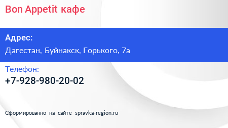 Bon Appetit, кафе по адресу Дагестан, Буйнакск, Горького, 7а в дальнейшем Организация, размещена в следующих категориях: