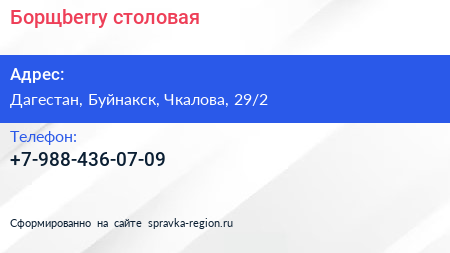 Борщberry, столовая по адресу Дагестан, Буйнакск, Чкалова, 29/2 в дальнейшем Организация, размещена в следующих категориях: