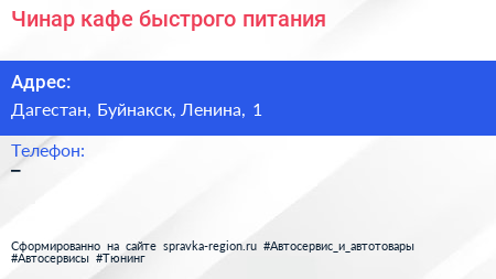 Чинар, кафе быстрого питания по адресу Дагестан, Буйнакск, Ленина, 1 в дальнейшем Организация, размещена в следующих категориях: