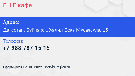 ELLE, кафе по адресу Дагестан, Буйнакск, Халил-Бека Мусаясула, 15 в дальнейшем Организация, размещена в следующих категориях: