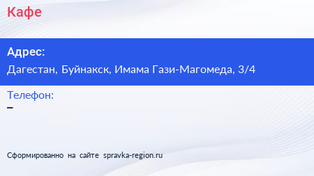 Кафе по адресу Дагестан, Буйнакск, Имама Гази-Магомеда, 3/4 в дальнейшем Организация, размещена в следующих категориях: