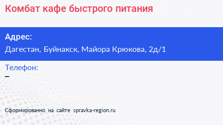 Комбат, кафе быстрого питания по адресу Дагестан, Буйнакск, Майора Крюкова, 2д/1 в дальнейшем Организация, размещена в следующих категориях: