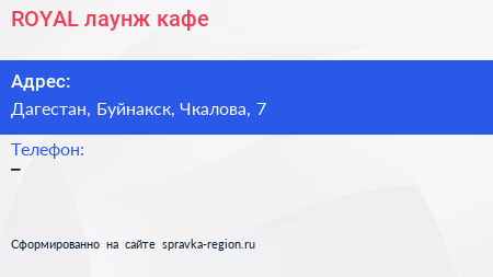 ROYAL, лаунж-кафе по адресу Дагестан, Буйнакск, Чкалова, 7 в дальнейшем Организация, размещена в следующих категориях: