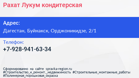 Рахат Лукум, кондитерская по адресу Дагестан, Буйнакск, Орджоникидзе, 2/1 в дальнейшем Организация, размещена в следующих категориях: