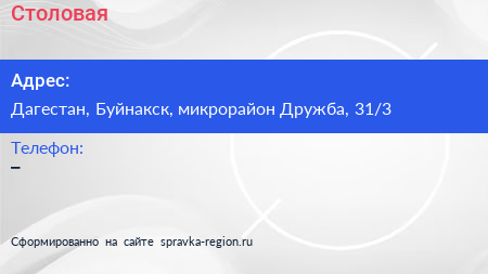 Столовая по адресу Дагестан, Буйнакск, микрорайон Дружба, 31/3 в дальнейшем Организация, размещена в следующих категориях: