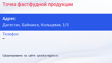 Точка фастфудной продукции по адресу Дагестан, Буйнакск, Кольцевая, 1/5 в дальнейшем Организация, размещена в следующих категориях: