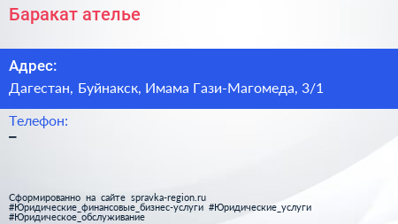 Баракат, ателье по адресу Дагестан, Буйнакск, Имама Гази-Магомеда, 3/1 в дальнейшем Организация, размещена в следующих категориях: