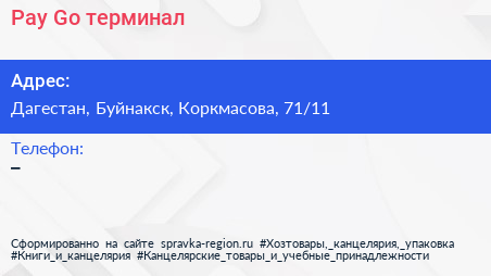 Pay-Go, терминал по адресу Дагестан, Буйнакск, Коркмасова, 71/11 в дальнейшем Организация, размещена в следующих категориях: