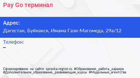 Pay-Go, терминал по адресу Дагестан, Буйнакск, Имама Гази-Магомеда, 29а/12 в дальнейшем Организация, размещена в следующих категориях: