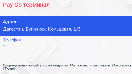 Pay-Go, терминал по адресу Дагестан, Буйнакск, Кольцевая, 1/5 в дальнейшем Организация, размещена в следующих категориях: