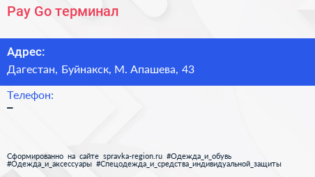 Pay-Go, терминал по адресу Дагестан, Буйнакск, М. Апашева, 43 в дальнейшем Организация, размещена в следующих категориях: