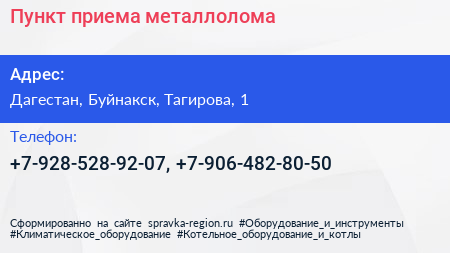 Пункт приема металлолома по адресу Дагестан, Буйнакск, Тагирова, 1 в дальнейшем Организация, размещена в следующих категориях: