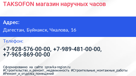 TAKSOFON, магазин наручных часов по адресу Дагестан, Буйнакск, Чкалова, 16 в дальнейшем Организация, размещена в следующих категориях: