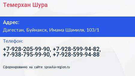 Темерхан Шура по адресу Дагестан, Буйнакск, Имама Шамиля, 103/1 в дальнейшем Организация, размещена в следующих категориях: