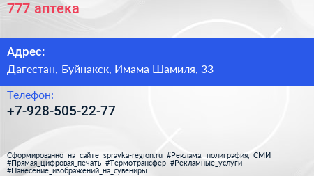 777, аптека по адресу Дагестан, Буйнакск, Имама Шамиля, 33 в дальнейшем Организация, размещена в следующих категориях: